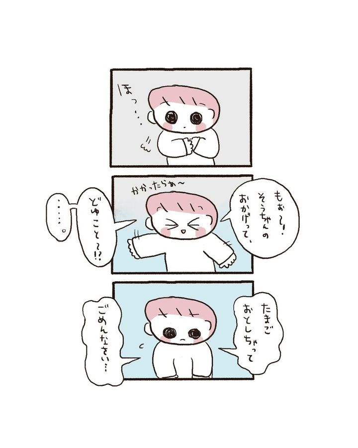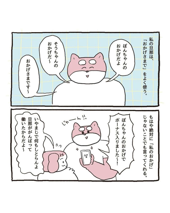 伊藤ぽんぽこ(@ito_ponpoko)さんの夫の口癖は「おかげさま」。「ボーナスがもらえたのは妻のおかげ」という夫に、何もしていないと言ったところ「自分が仕事中に家事と育児をしてくれている」と、うれしいことを言われます。そんな夫の言う「おかげさま」を自分も使っていこうと思った伊藤ぽんぽこさん。すると、息子も「ママのおかげ」と言ってくれるように。「おかげさま」が家族にも伝わっているとうれしくなるのでした。