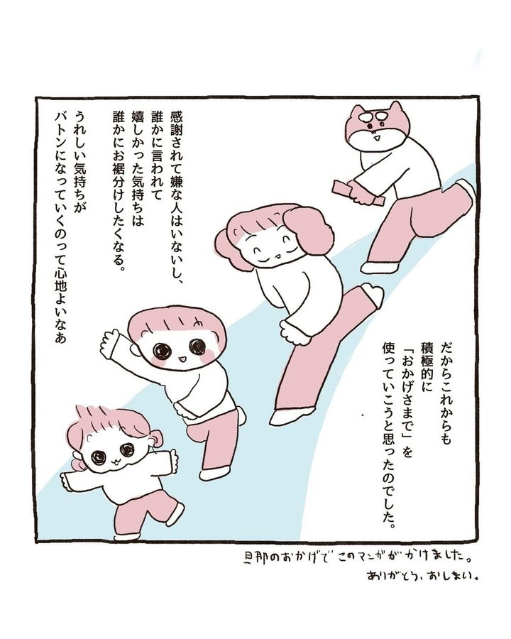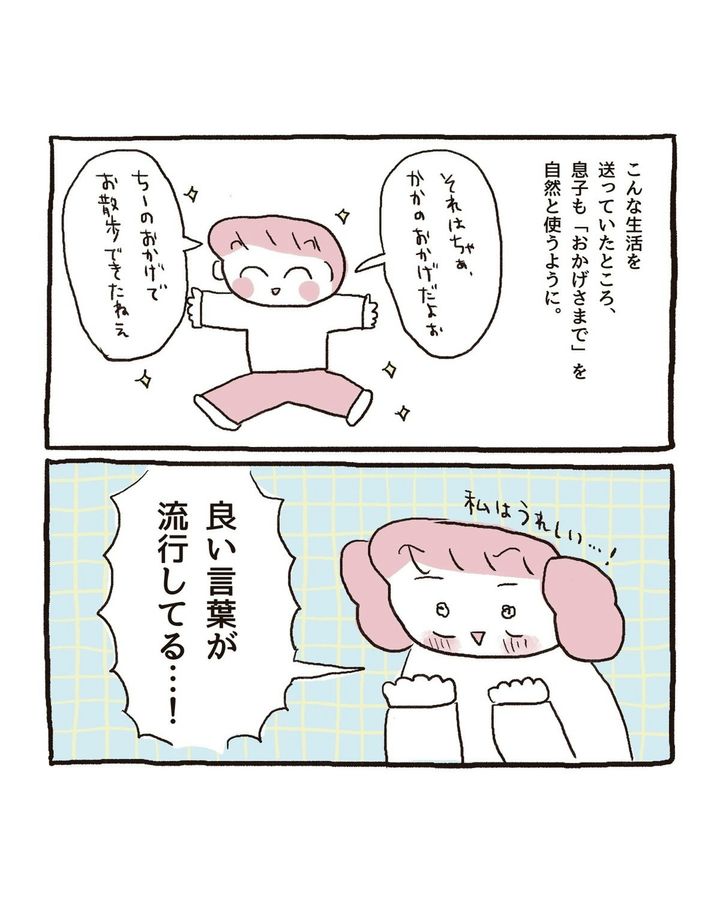 「おかげさま」の言葉の力で、伊藤ぽんぽこさんの家族はいつも幸せでいられるのかもしれませんね。素敵な言葉は自分を守ってくれると思うと、積極的に「おかげさま」を使いたくなりますね。