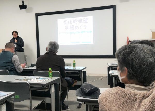 朝9時、松山城ロープウェイ東雲口駅舎内2階会議室に集合。最初にイベントの意義や見るべきポイントなどを説明していただきます。愛媛大学大学院理工学研究科准教授の郡司島宏美先生にお話いただいたのですが、この話が面白い!「景観」という言葉の意味からはじまって、「景観を守る」とはどういうことで、どのような取り組みが行われているのかなどを写真やイラスト使って分かりやすく説明してくださいました。 今まで何気なく見ていた景色の見え方がガラッと変わるような感じがして、個人的には想像の5倍ぐらい面白くあっという間の時間でした。この話を聞けただけでも参加してよかったなと思います!