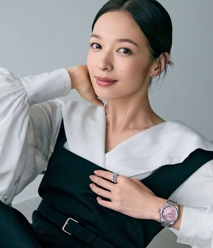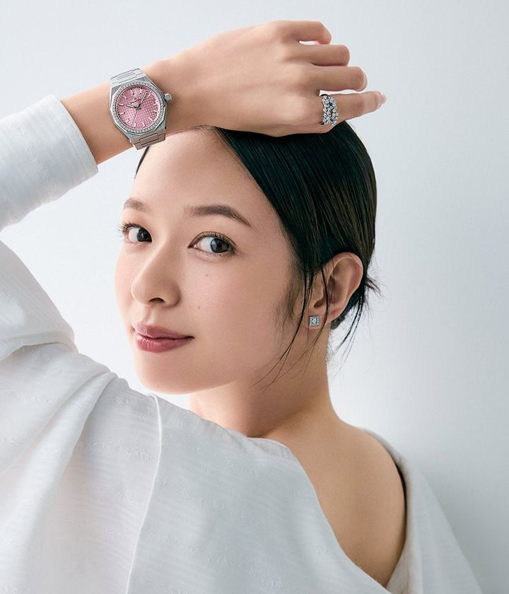 時計「デファイ スカイライン 36」〈SS × DIA、36㎜、自動巻き、メタルブレスレット〉¥1,717,100(ゼニス/LVMHウォッチ・ジュエリー ジャパン ゼニス)左手人差し指につけたリング¥657,800ピアス¥526,900(ともにダミアーニ/ダミアーニ・ジャパン)ワンピース¥132,000中に着たブラウス¥70,400(ともにフェティコ/ザ・ウォール ショールーム)