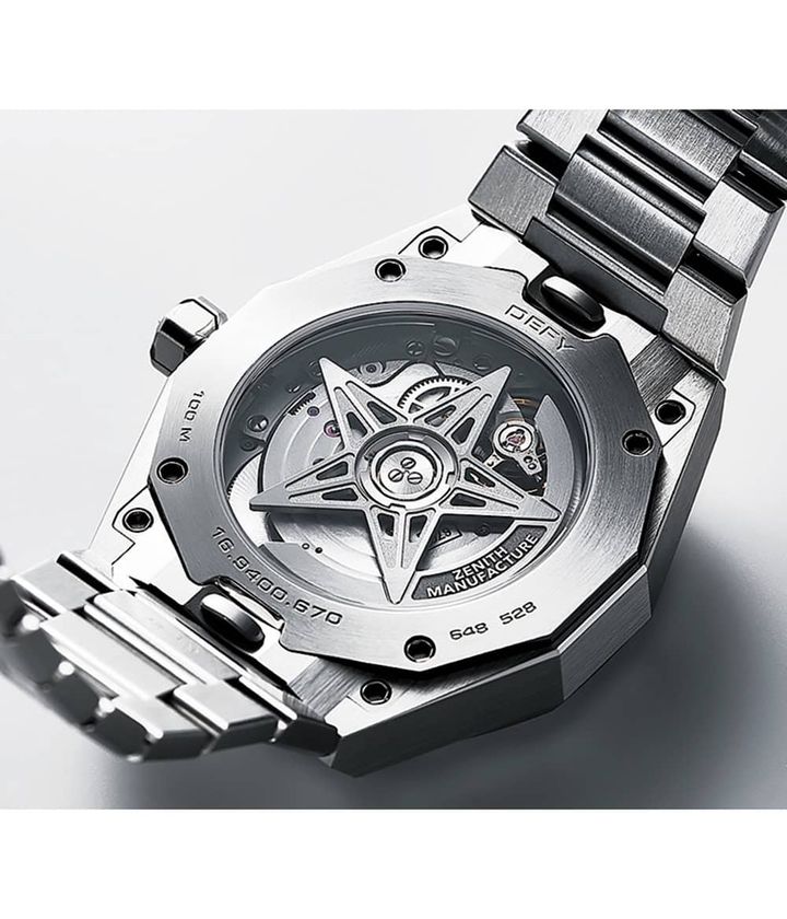 時計はゼニス。1969年に発表された、デファイコレクションのデザインを現代的に再解釈したモデル。文字盤のカラーは写真のほか、グリーンとネイビーの全4色展開です。