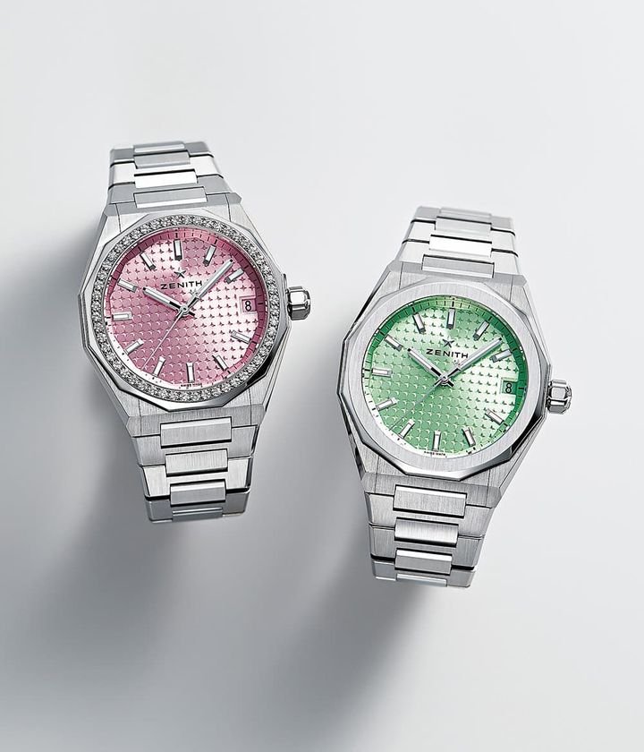 時計左時計「デファイ スカイライン 36」〈SS × DIA、36㎜、自動巻き、メタルブレスレット〉¥1,717,100 時計右「デファイ スカイライン 36」〈SS、36㎜、自動巻き、メタルブレスレット〉¥1,212,200(ともにゼニス/LVMHウォッチ・ジュエリー ジャパン ゼニス)