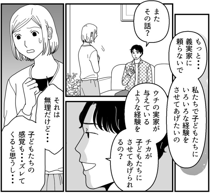 私(チカ)は夫のヒロトと娘・ミオ(小2)、息子・コウキ(年長)との4人暮らしです。ヒロトはいつも私抜きで、子どもたちだけを連れて義実家へ行きます。私が義実家から絶縁される一方、子どもたちは義実家の財力でどんどん贅沢を覚えさせられていきました。そんなある日、私は妹のユミに「今の状況は子どもたちにとって良くないし、夫婦関係も破綻している」と指摘されます。私はヒロトともう一度しっかりと話し合わなくてはいけません。