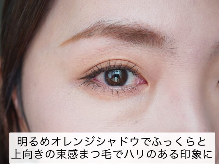 アイシャドウのカラーは、オレンジ系がおすすめ。オレンジには血色感を与えながら、まぶたをふっくらと見せる効果が期待できるため、まぶたが痩せて気になる方にもぴったりのカラーです。