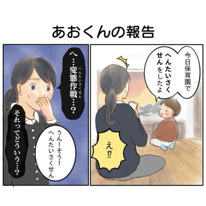 こやま家(@koyama.ke)さんのママは、息子が幼稚園で「へんたいさくせん」をしたと聞いてびっくり。「変態作戦」…?何度聞いても「へんたいさくせん」と真剣な顔で言う息子に不安がっていると、実は…。
