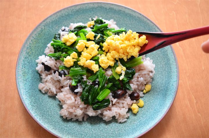 ほんのりあずき色のご飯と黒豆に、ほうれん草の緑と炒り卵の黄色が鮮やかで、シックだけど華やかな一品です。