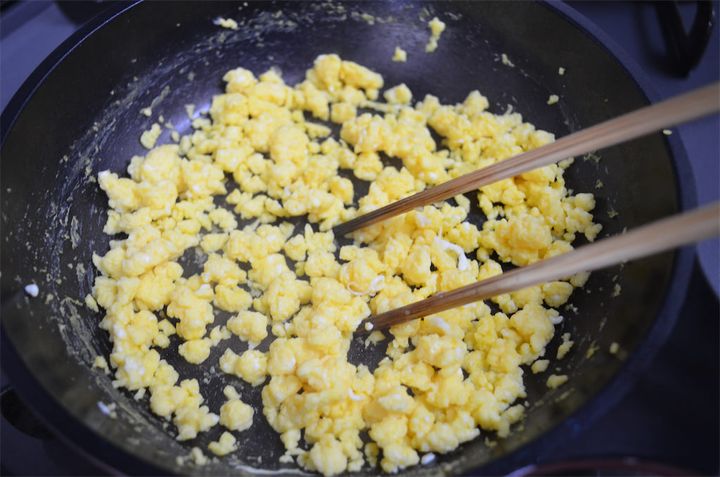 5. 鍋に卵を割り入れ、[A]を加えて混ぜ合わせる。熱したフライパンに流し入れ、中火で炒り卵を作る。