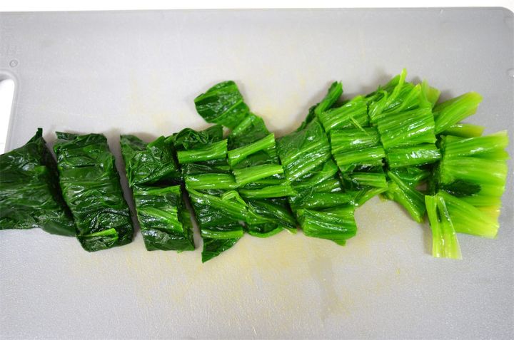 6. ほうれん草は根元をよく洗ったら、沸騰した湯で塩茹でして冷水に上げ、水気を切ったあと、2cm幅に切る。