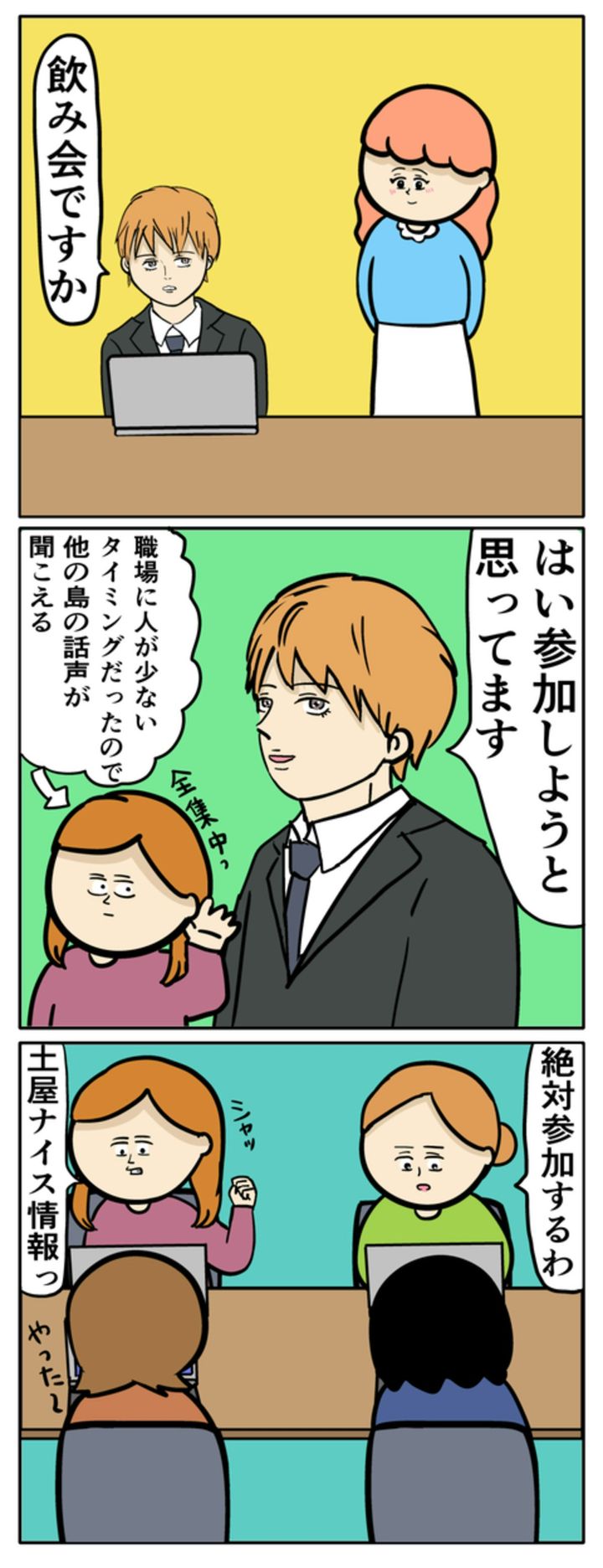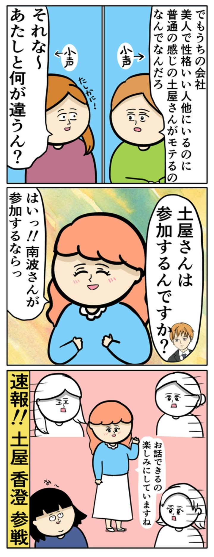 土屋さんのおかげで、南波さんが飲み会に参加するという情報を手に入れます。岡田さんの同僚3人は気合が入ります。しかし、それと同時に土屋さんも南波さん狙いだということが判明し、思わず固まってしまいました。