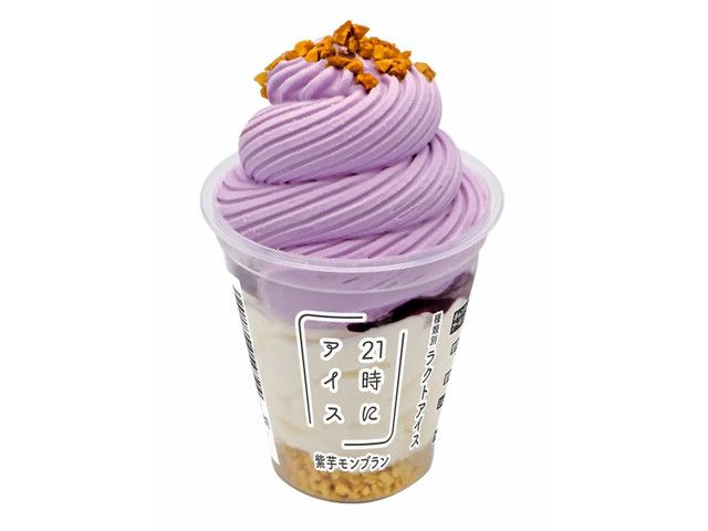 21時にアイスの人気上位フレーバー「紫芋モンブラン」を、天面の巻き形状で表現。スッキリしたミルクアイスと濃厚な紫芋アイスの2種の味わいに、紫芋ペーストを配合した紫芋ソースがよく絡み、素材本来の濃厚な味わいをお楽しみいただけます。 首都圏・関西のセブン-イレブンで販売
