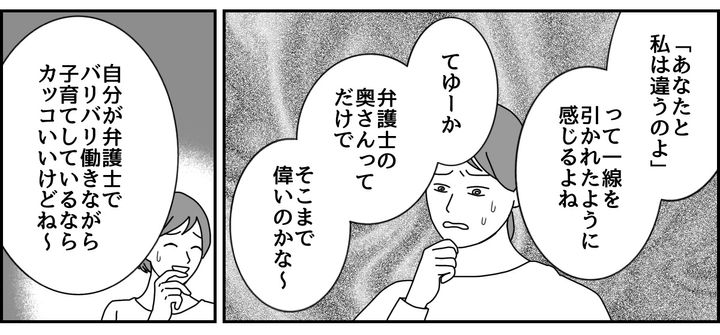 私(ノゾミ)は、夫と2人の子ども(小4と小1)を育てています。現在は市役所に勤めており、夫とは職場結婚。家事・子育て・仕事と毎日多忙ですが、昔から誰よりも努力してきたし、自分の足で立つ今の生活に誇りを持って頑張っています! 小学校からの親友のサオリは、私よりも早くに結婚して現在は3人の子ども(小6・小3・年長)のママ。高層マンションに住み、専業主婦をしています。会うたびに感じるのは、サオリの話は私とは次元が違うなということ。そしてとうとうサオリから「住んでいる世界が違うからごめんね」と言われてしまったのでした。翌日、同僚にサオリとのやり取りについて相談してみることにしました……。