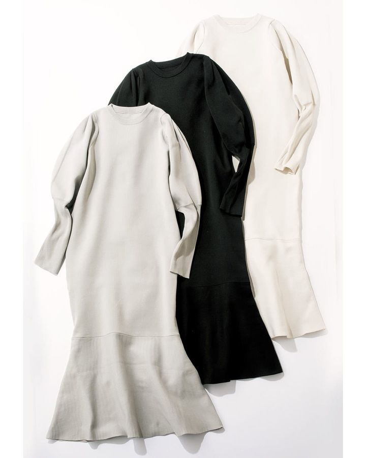 美しいハリのあるミラノリブで編み上げた上品なワンピース。ボリューミーな肩回りときゅっと絞られた袖口のバランスが他にはないデザイン。自宅で洗濯できるので、デイリーに活躍。
