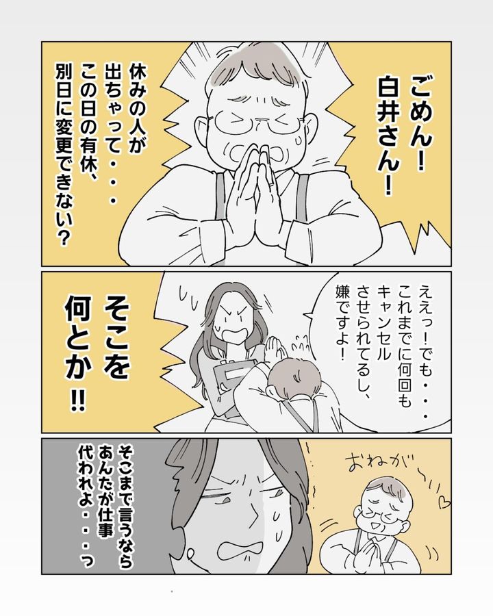 「ごめん白井さん!休みの人が出ちゃって・・・この日の有休、別日に変更できない?」と申し訳なさそうに手を合わせる部長。「ええっ!これまでに何回もキャンセルさせられてるし嫌ですよ!」そう断りましたが、「そこを何とか!」と半ば強引に押し切られ、結局申請していた有休は別日に変更されてしまいました。