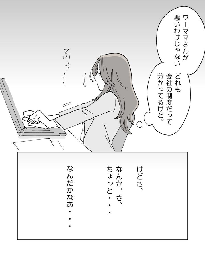 独身で子どもがいないという理由から、ワーママさんの『シワ寄せ役』にされていることに不満を抱く白井さん。早退した同僚の仕事を毎回引き受けさせられたり、申請した有休を何度も変更させられたり・・・一度きりならまだしも、重なれば重なるほど不満が募ってしまうのも無理はありません。頭では「仕方がない」と理解していても、割り切れない気持ちが残ってしまいますよね。