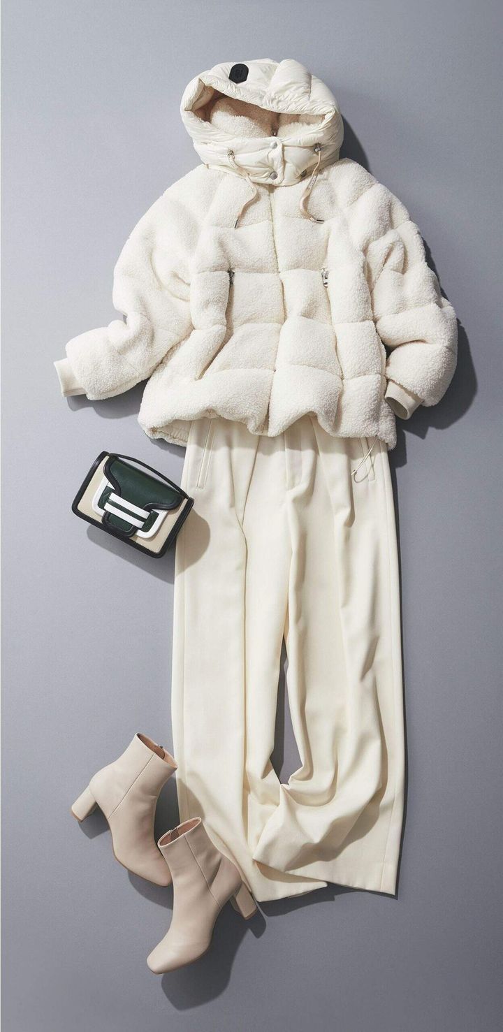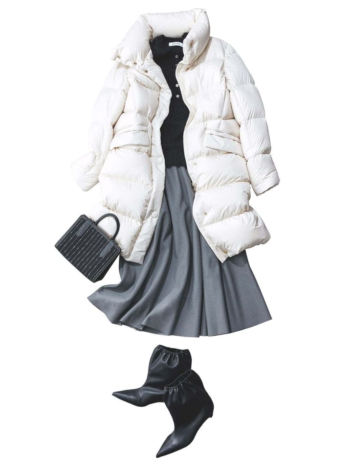 ふわっとした雪のようなダウンは、今らしさたっぷり。色味に加えて、コート風に着れる丈感を備えているので着映えにも期待できるんです!コンサバなコーデを女性らしい装いにまとめます。