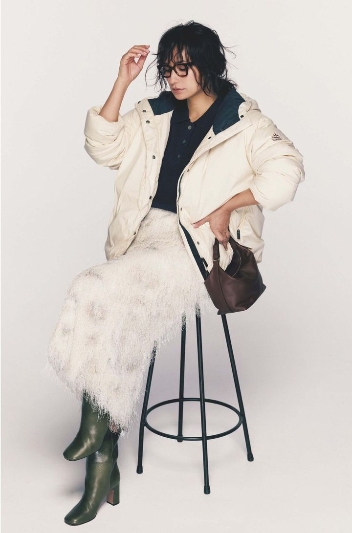 ダウンジャケット¥106,700(ピレネックス/ピレネックス マロニエゲート銀座)ニットポロ¥39,600(デミリー/リトルリーグ インク)スカート¥97,900(エブール/リトルリーグ インク)バッグ¥253,000(ヴァレクストラ/ヴァレクストラ ジャパン)ブーツ¥143,000(ペリーコ/アマン)メガネ¥49,500(モスコット/モスコット トウキョウ)