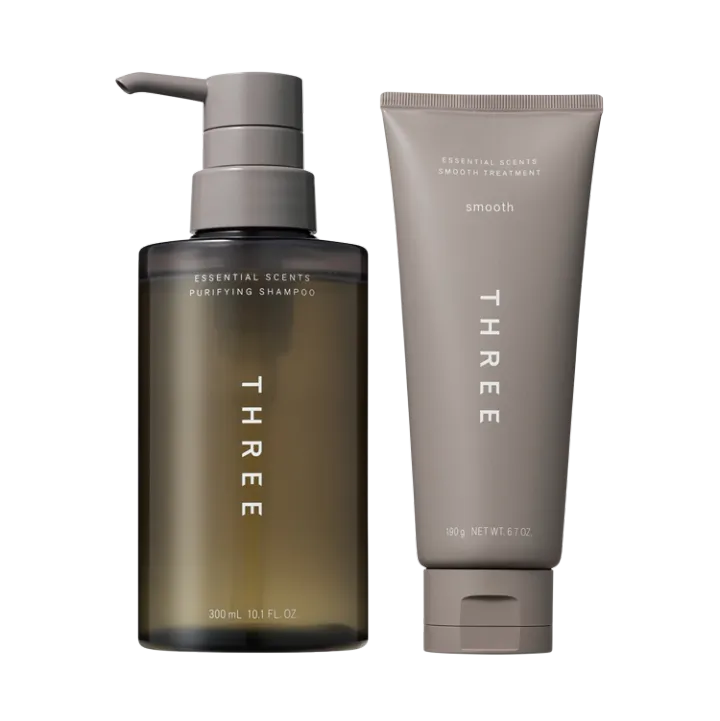 〈左〉エッセンシャルセンツ ピュリファイング シャンプー 300mL 4,180円、〈右〉同 スムーストリートメント 190g 4,400円/ともにTHREE