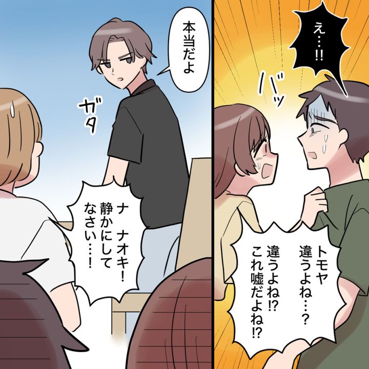 「え・・!!」みるみる青ざめるトモヤに、「トモヤ違うよね・・?違うよね!?これ嘘だよね!?」と詰め寄ると、「本当だよ」そう言って立ち上がるナオキさんを見て、「ナ、ナオキ!静かにしてなさい・・!」と義母が慌てて止めに入りました。