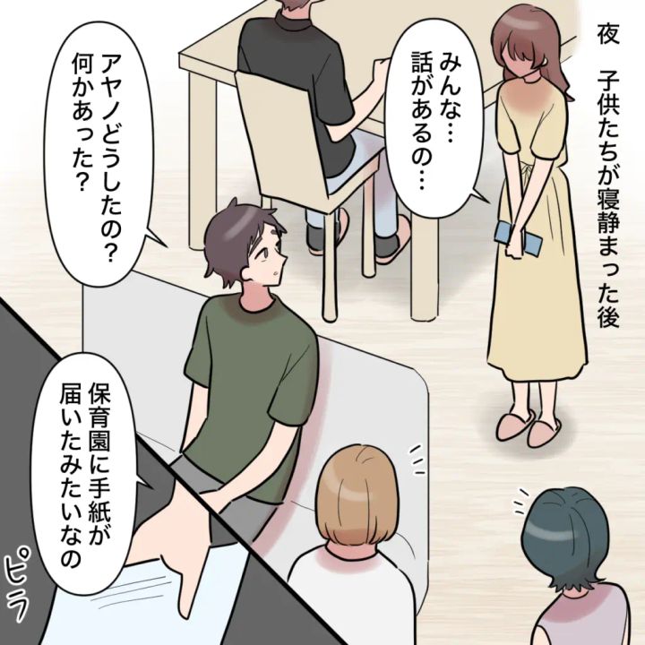 「みんな・・話があるの」と切り出した私。「アヤノどうしたの?何かあった?」トモヤにそう聞かれ、「保育園に手紙が届いたみたいなの」そう言って手紙を開きました。