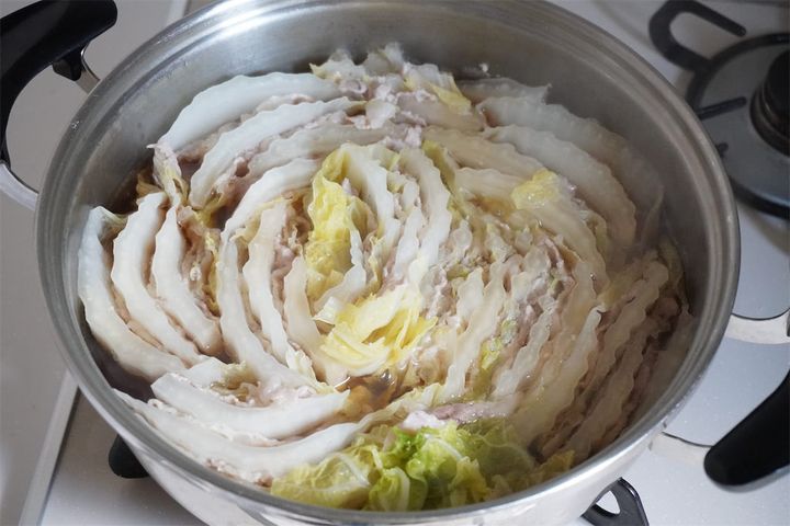 白菜に豚バラ肉2~3枚を並べて、その上にまた白菜、豚肉を重ねて、5~6層を目安にしてください。