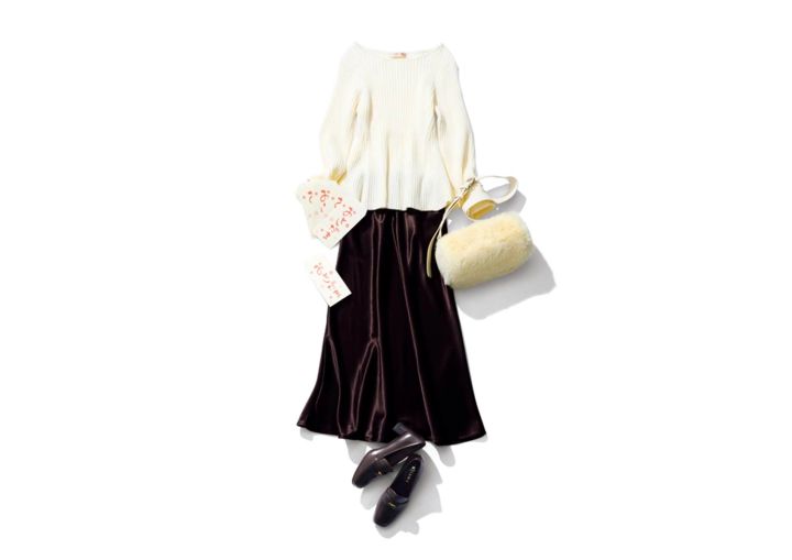 サテンスカート¥5,000/Olu. レースキャミソール付きチュニック(チュニック)¥23,100/アプワイザー・リッシェ コインローファー¥18,150/ダイアナ(ダイアナ 銀座本店) ファーバッグ¥7,900/Olu.