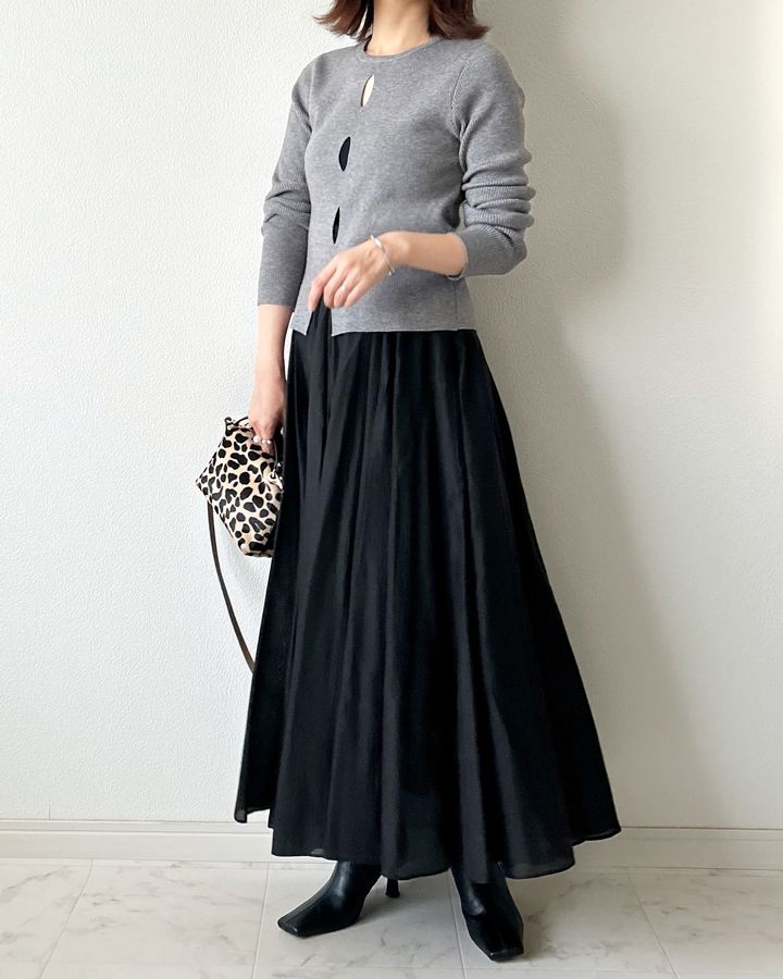 デコルテの肌見せがヘルシーで大人っぽい、細リブニットが主役のコーディネート。インフルエンサーのtomonomiyukiさん(身長不明)が着ているのは、デコルテラインがきれいなフロントのホールデザインが特徴の細リブニットです。リブの縦ラインがすっきりとした印象を与え、着膨れせず、きれいなシルエットに見せてくれます。ボトムスには、黒のロングフレアスカートを合わせ、全身をモノトーンで統一。スカートのボリューム感が、上半身のコンパクトなニットとのバランスを絶妙にとっています。ボトムスを黒でまとめることで、細リブニットの上品さが引き立ち、大人かわいい着こなしになっています。レオパード柄のバッグが、コーディネートの遊び心あるアクセントに。