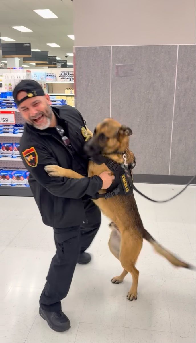 その男性の顔を見た警備犬は、仕事を忘れて大はしゃぎ! 喜びを抑えきれず、男性に飛びついていきます。
