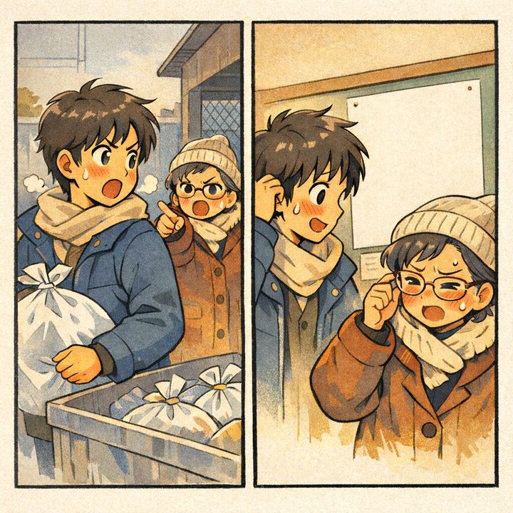 「よし、これでスッキリ」とゴミ袋を置いたその時、「ちょっと! あなた、ゴミ出しの日を間違えてますよ!」という鋭い声が響きました。