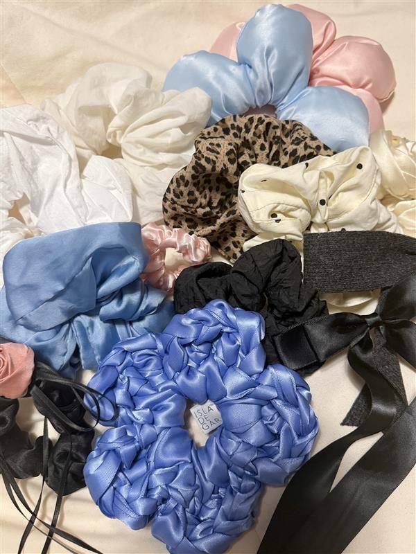ここ2年くらい、シュシュに目がない私。展示会や旅行先でも、気になるものを見つけるとついつい写真を撮ったりメモしたり……。つけていない日は無いくらい、毎日のスタイリングに欠かせない存在です。おかげで最近は「シュシュキャラ」が定着してきてうれしい限り。