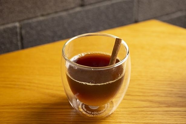 「りんごジュースと果肉入りりんごジャムを加えて温め、スマトラコーヒーと半々で合わせ、仕上げにシナモンスティックを。ミルクより軽く、ほっとする飲み口で、ライトユーザーにも気軽に楽しめるアレンジです。バターを加えて塩味をアクセントにするのもおすすめです」