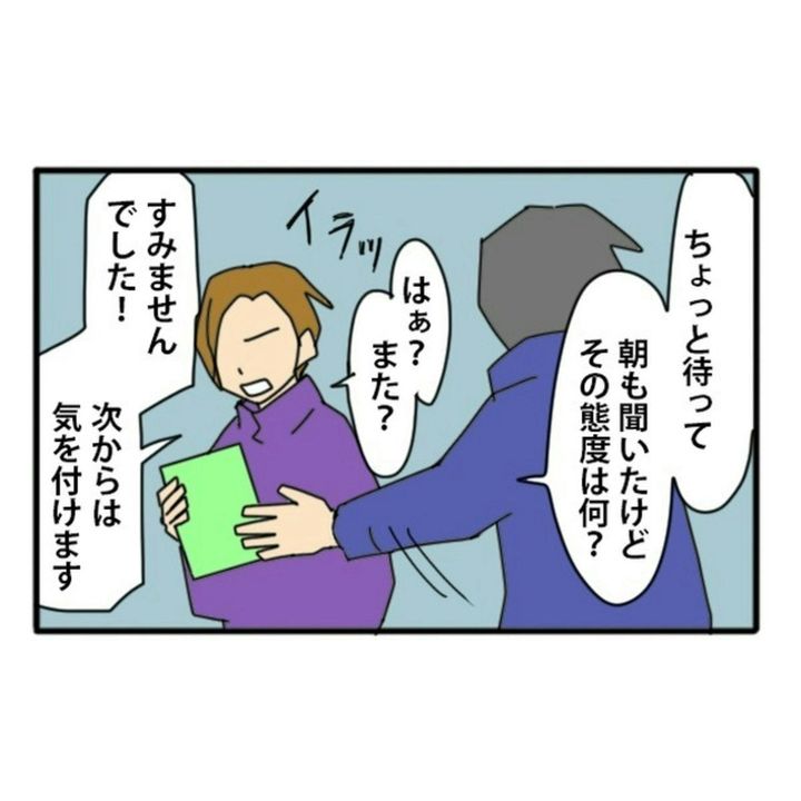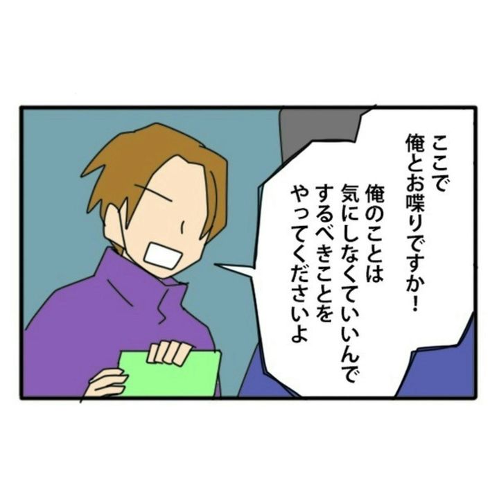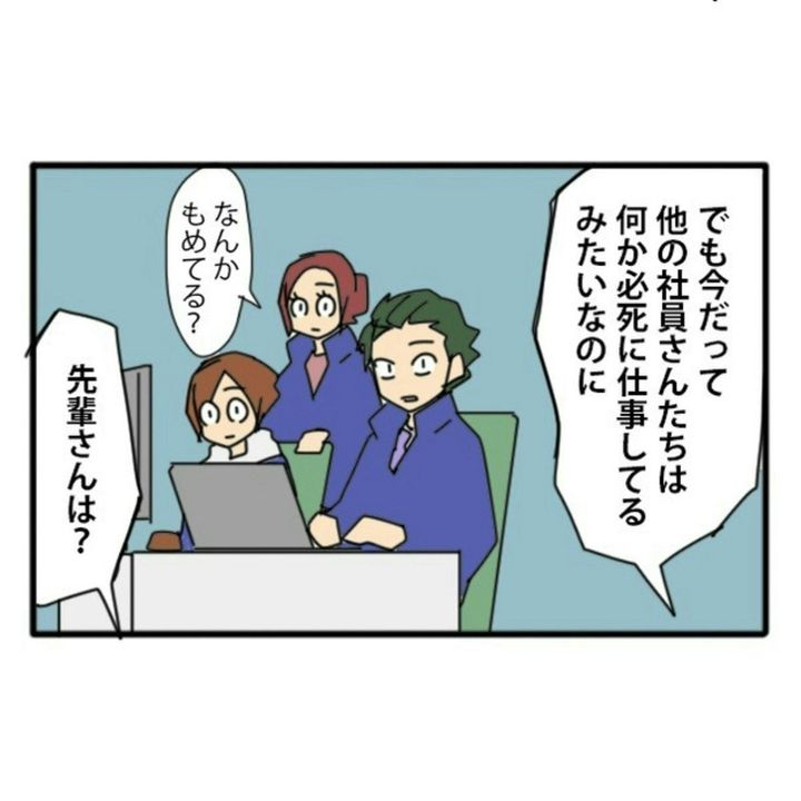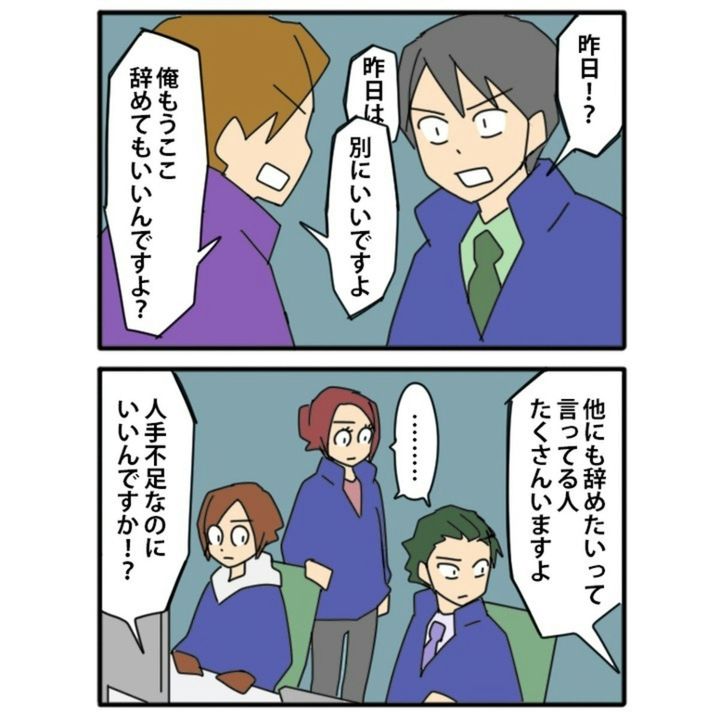 先輩さんに不満を一方的にぶつけるアルバイトスタッフ…。それに対し、先輩さんは冷静に対応しようとしますが、アルバイトは「辞めてもいいんですよ?」と、まるで脅しのような文句を吐き捨てます。このあと、課長と他の社員が制止に入り、この場は収まりました。