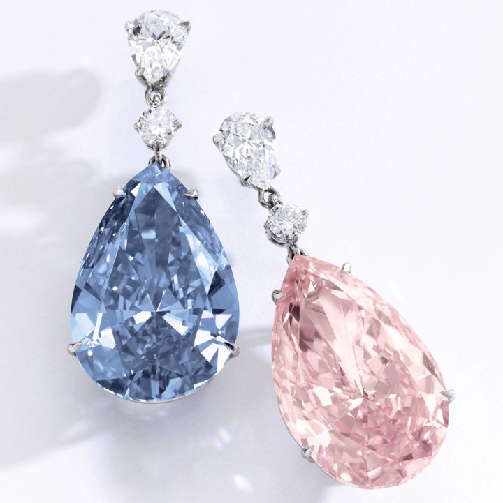史上最高額となる約5740万ドル(約89億円)で落札されのは、どちらもペアシェイプにカットされたブルーダイヤモンドとピンクダイヤモンドで作られたイヤリングのセット。