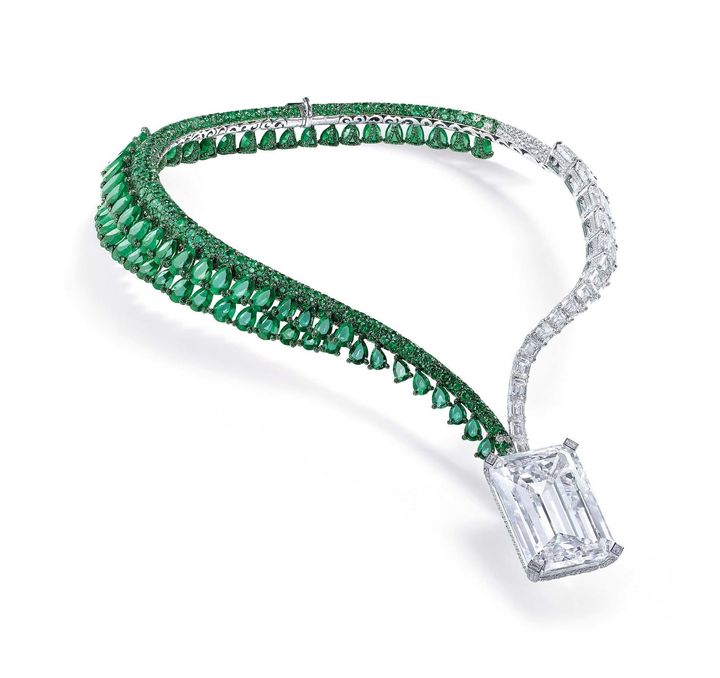 ペアシェイプのエメラルドとレクタンギュラー(長方形)カットのダイヤモンドを使用し、より小粒にカットしたそれぞれの宝石がパヴェセッティングにも使われているこのネックレスは、スイスの高級宝飾ブランド、「ドゥ グリソゴノ」が制作したもの。価格は約3370万ドル(約52億円)となっています。