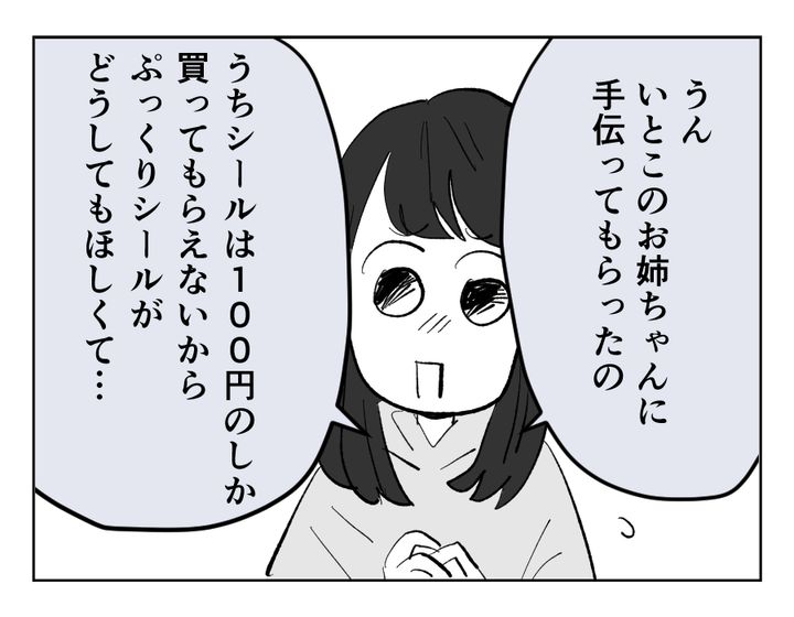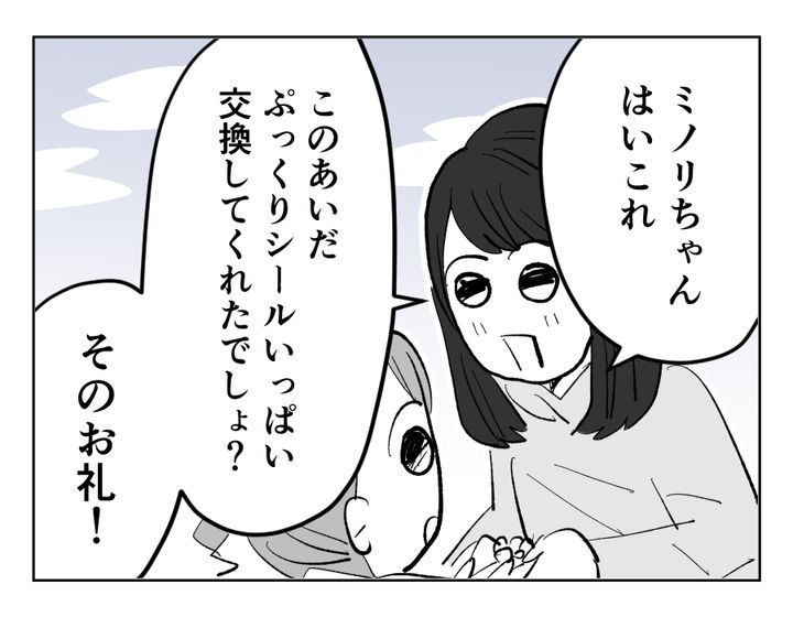 今回の主人公は30代のママ、ユイさん。ひとり娘のミノリちゃんを大切に育てています。ある日ミノリちゃんは、高価で希少価値のあるぷっくりシールとペラペラで安そうなシールを、お友だちのシオンちゃんと大量に交換してきてしまいました。ミノリちゃんがシール搾取されている! と感じたユイさん。そこでユイさんは、今後のためにもミノリちゃんにさまざまな働きかけをするのでした。