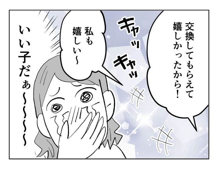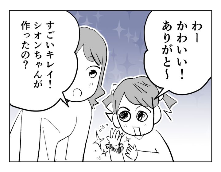 あの「割に合わない」と感じたシール交換には、このような背景があったのですね……。たしかにシールは急を要して必要になるものではありません。常に買ってもらえる子もいれば、そうでない子もいることでしょう。ユイさんにとってはペラペラのシール。でもシオンちゃんにとっては数少ない手持ちの中で大切にしていた大きなシールです。それでもミノリちゃんのぷっくりシールと自分のシールでは同等でないと感じていたようで……。手作りのアクセサリーをミノリちゃんにプレゼントしてくれました。自分にできることを一生懸命考えてきてくれた姿がなんとも健気で、ユイさんは心を打たれました。
