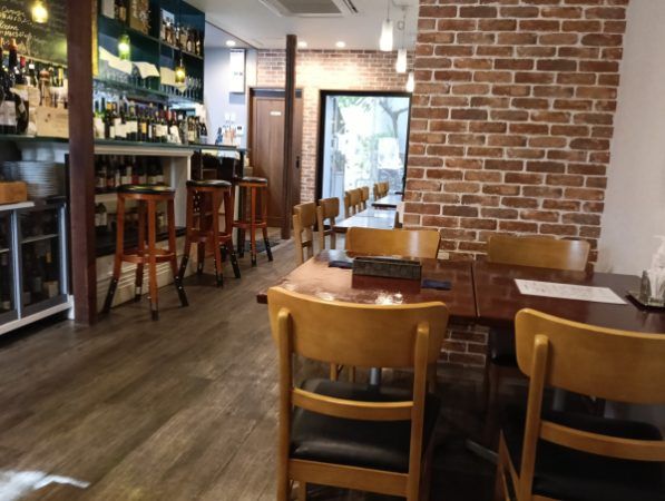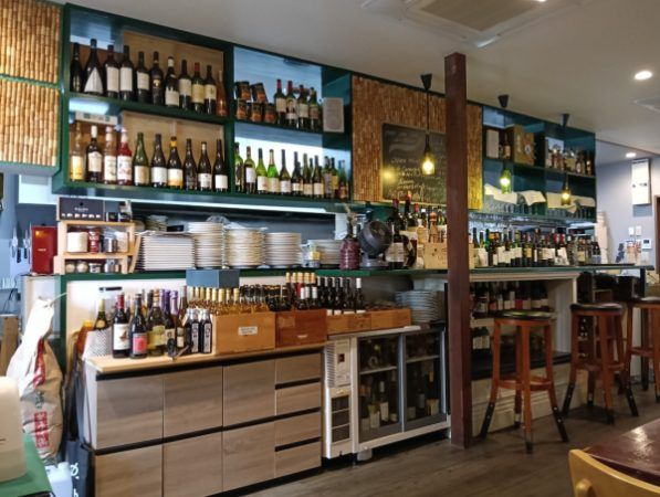 ワインの種類が豊富です。 たくさん並んでいます。 オープンキッチンです。 カジュアルで落ち着いた雰囲気の店内です。