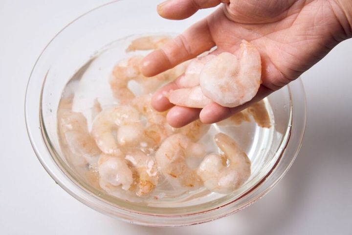 (1)ボールに塩分濃度約3%の塩水(水3カップに塩大さじ1が目安)を作り、冷凍むきえびを入れる。