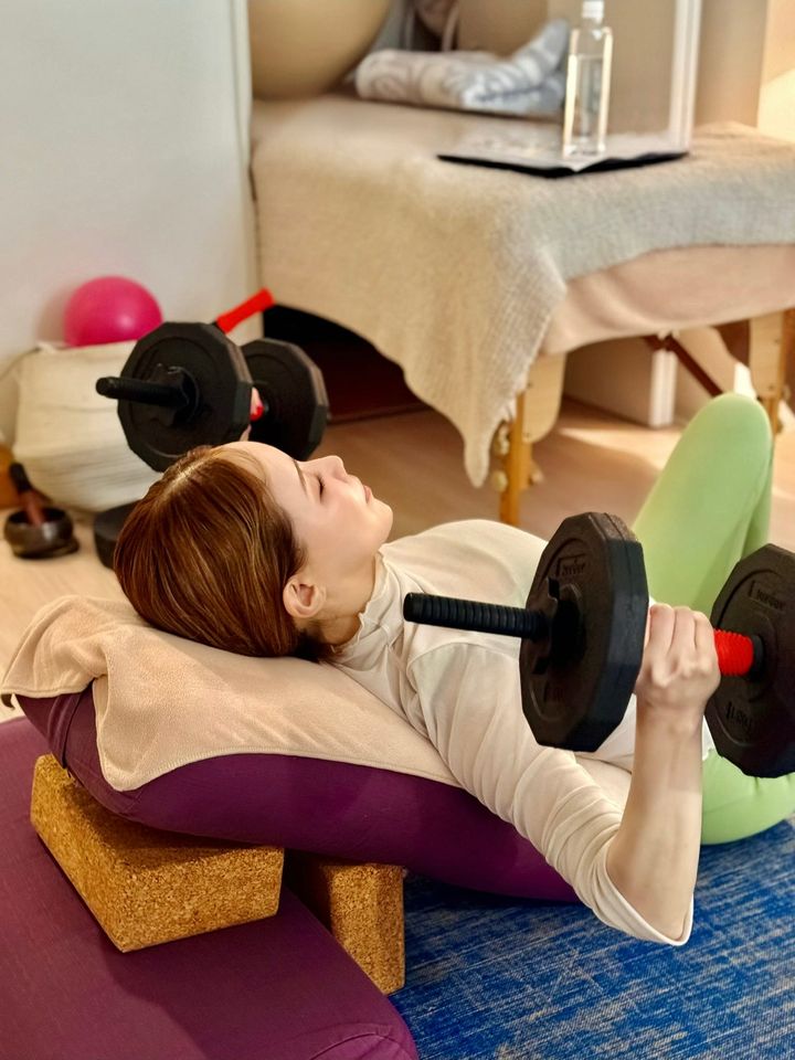 「初トレーニング。ボディメンテナンスは意外にコツコツ出来ずに一気に追い込む私。だからトレーニング後の身体は筋肉が緊張して凝りの原因にもなることも。FAS ザ ドレープボディミルク(YUGIRI/HATSUNONE)でしっかりとほぐして、乾燥に傾きやすい冬の肌も一緒にケアします。今年もこの身体で頑張ってもらうのでボディのご機嫌取りにはFASが一番。いつも、どちらの香りを選ぶか悩むほどのセンス抜群な調香に脳までご機嫌」(西村さん)