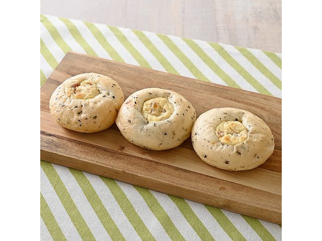 バジルを練り込んだ生地に、ベーコンとチーズクリームをトッピングして焼き上げた、フランスパンの3個入りです。