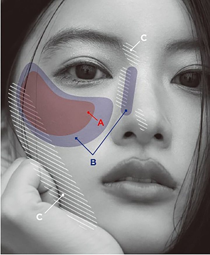 頰全体からこめかみにかけて広くブルー系ハイライト(B)を広げ、頰骨の高い位置を中心にそら豆形にピンクチーク(A)を重ねる。さらにBを鼻の側面にものばすと立体感がアップ。シェーディング(C)は、3色を混ぜて、フェイスライン、眉頭下、鼻筋&鼻先の両サイドに入れてシェイプ。