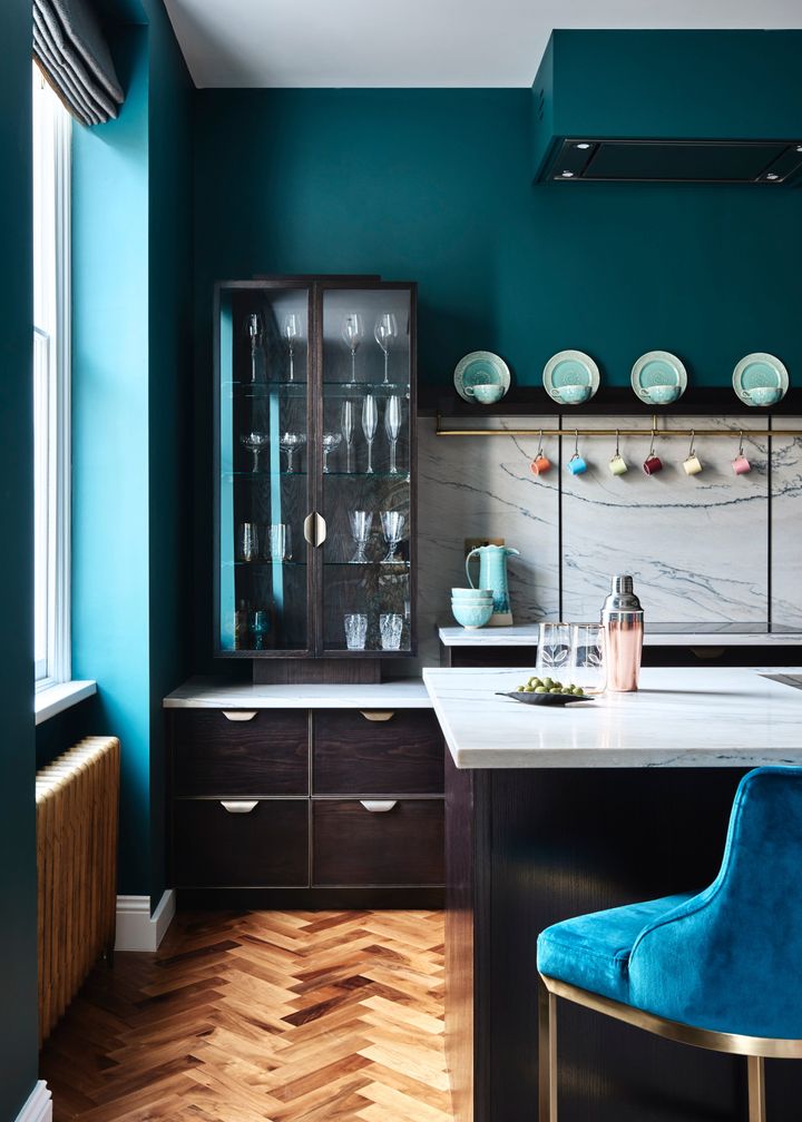 さまざまな素材が並ぶキッチンでは、よりダークでドラマチックな色を加え、コントラストを意識しよう。写真では、ティールグリーンが、バースツールや陶器のディスプレイに使われ、それらが筋の見える大理石の表面やヘリンボーンの床へと視線を誘う。カラーが空間を圧倒するのではなく、他の要素を引き立てているのだ。