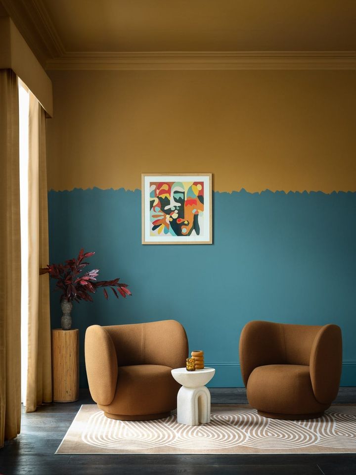 デコレーションに使うことができるツールの中でも、塗料は非常に便利なアイテム。ぜひ楽しく使いこなしてもらいたい。このリビングでは、イエロー・オーカーの壁にブルーのコントラストを効かせた。色の境目が目線のやや上なので、部屋でくつろいでいる時にも(色の切り替わりがノイズになることなく)心地よく過ごせる。
