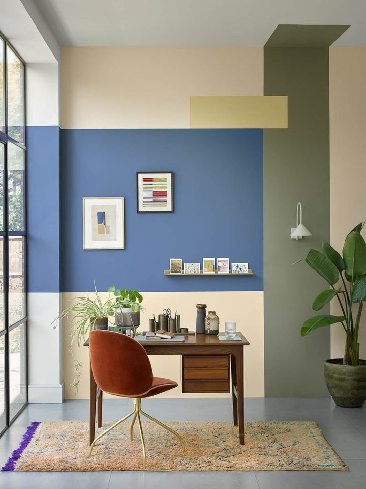 塗料は、オープンプランの空間を仕切るのにも役立つ。写真のホームオフィスでは、窓の方へ伸びるグラフィカルな2本のラインと天井から床にかけて引かれた垂直線がゾーニングの役割を果たしている。同じような効果をお望みなら、色の割合は、60対30対10程度を目指そう。多くの家では、壁面は一色だろうから、その3分の1の分量で補色を足し、最後にアクセントカラーを入れる。ミニマリストはベージュやグレー、マキシマリストなら暗めのジュエルカラーを選びたくなるかもしれないが、おすすめしたいのは、自然から着想を得たカラーパレット。大胆でありながら、やり過ぎてはいない——これなら、バランスの取れた仕上げを叶えることができる。