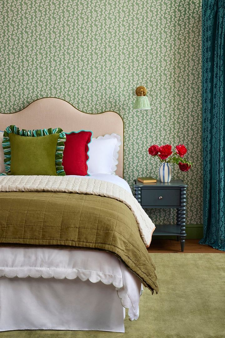 大胆なパターンを使った壁紙を、寝室にはふさわしくないと考える人は多いかもしれない。けれど、室内にある他の要素を少し控えめにすることで、どんなに主張の強いモチーフでも、落ち着いた印象に変えることができる。秘訣は、壁の四面をすべてを覆わず、ヘッドボードの後ろの壁だけにこうした壁紙を貼れば、ベッドに身体を休めながら横を向いた時、ニュートラルな景色を楽しむことができる。