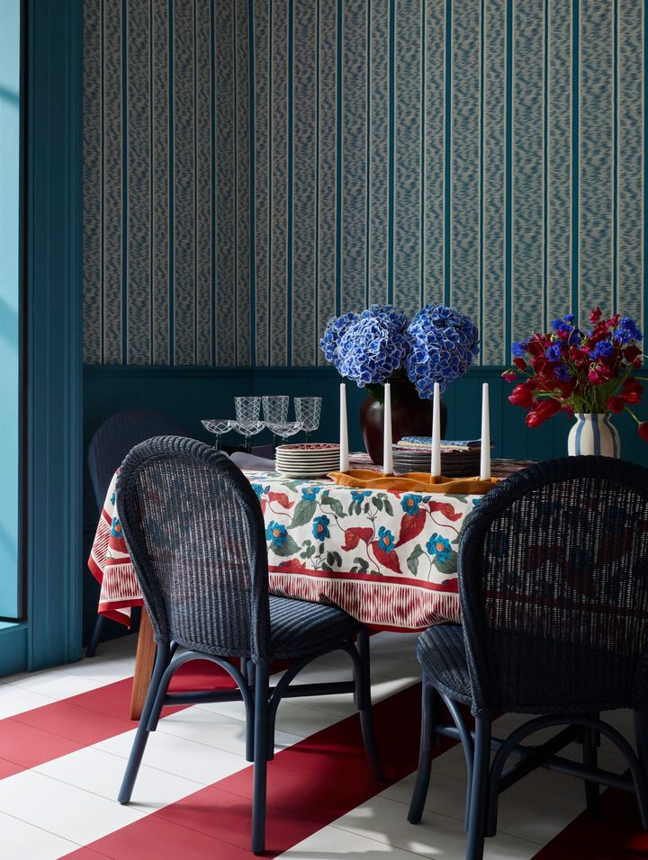 簡単に説明すると、まずは目を引くパターンを中心に置き(ここでは、フローリングのストライプ)、それよりもスケールの小さいパターンを広い表面(壁面がおすすめ)に適用する。そして、ごちゃごちゃした印象を緩和し、バランスをとるために、補色をちりばめた中程度のスケールのパターン(写真のテーブルクロスとナプキンに注目)を入れよう。