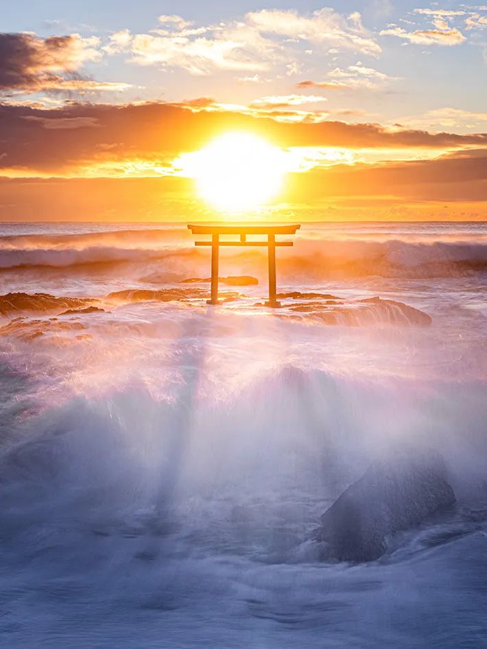 豪快な波の中にそびえ立つ鳥居に、堂々と昇っていく太陽…なんて神々しい光景なのでしょうか!