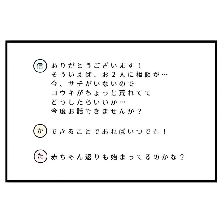 信也さんは慣れた手つきでスマホを操作し、「今サチがいないのでコウキがちょっと荒れててどうしたらいいか・・・今度お話できませんか?」と続けてメッセージを送ります。それを見たママ友たちは「できることがあればいつでも!」「赤ちゃん返りも始まってるのかな?」と親身になって話に応じてくれました。