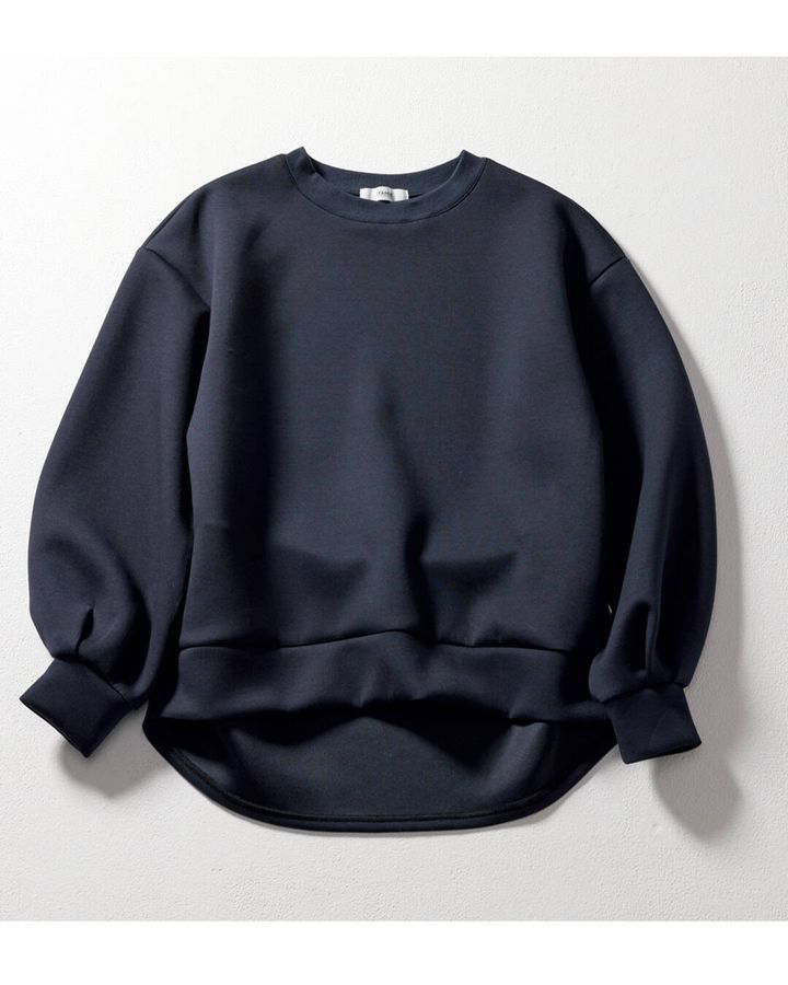 大ヒット中のスウェットにネイビーの新色を追加。コクーンシルエットとボリューム袖で着るだけで今っぽくなる名品スウェット。きれいめに着られるもっちり素材も大人には最適。