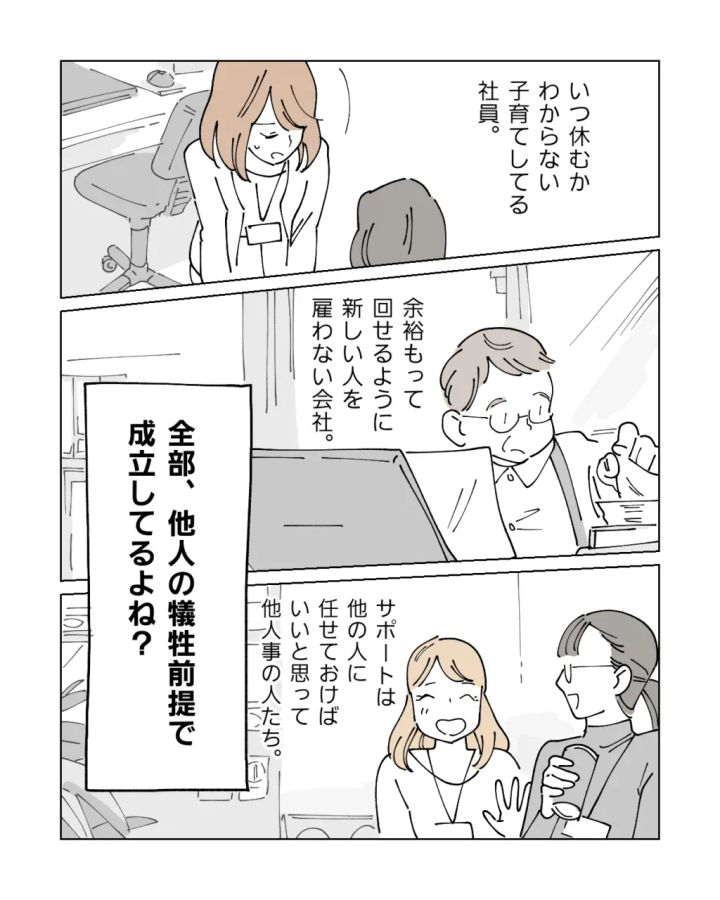 いつ休むかわからない子育てをしている社員、現場は常にギリギリなのに新しい人を雇おうとしない会社、サポートは他の人がやるのが当たり前と思っている人たち・・・全部他人の犠牲を前提に成立していることを分かっていない人が多すぎます。
