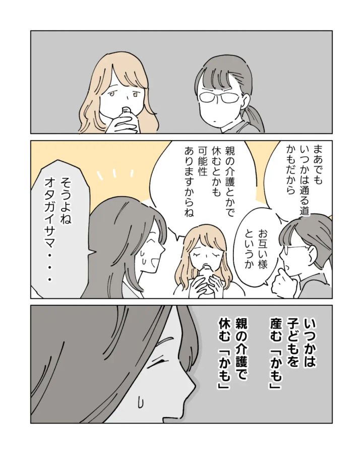 同僚は一瞬固まって私に冷たい視線を向けると、「まぁでもいつかは通る道かもだからお互い様というか」「親の介護とかで休む可能性もありますからね」と大宮さんをフォローし始めます。仕事と育児に奮闘するワーママさんを責めるのは、今の世間ではタブー。私は心の中でやってしまったとつぶやきながら、「そうよね、オタガイサマ・・・」と愛想笑いしました。